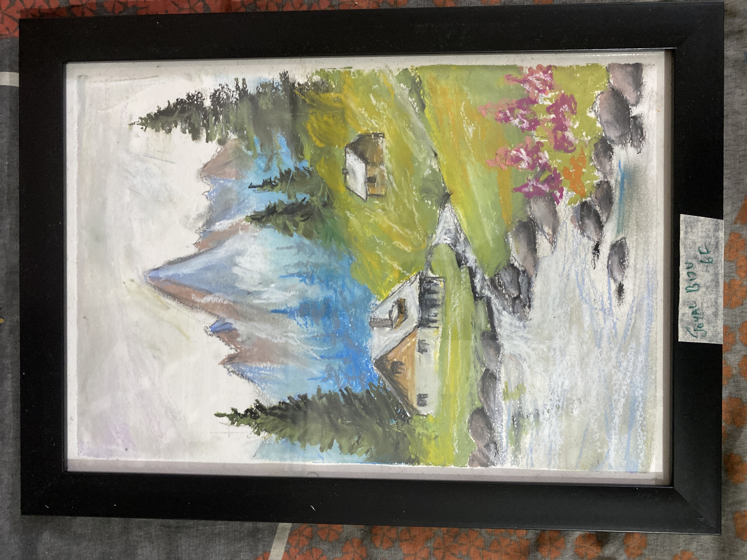 A vibrant landscape capturing the beauty of the natural world. Created using oil pastels, this piece features bold blending techniques and rich colors, showcasing the creativity and developing artistic perspective of the artist during his primary school years.