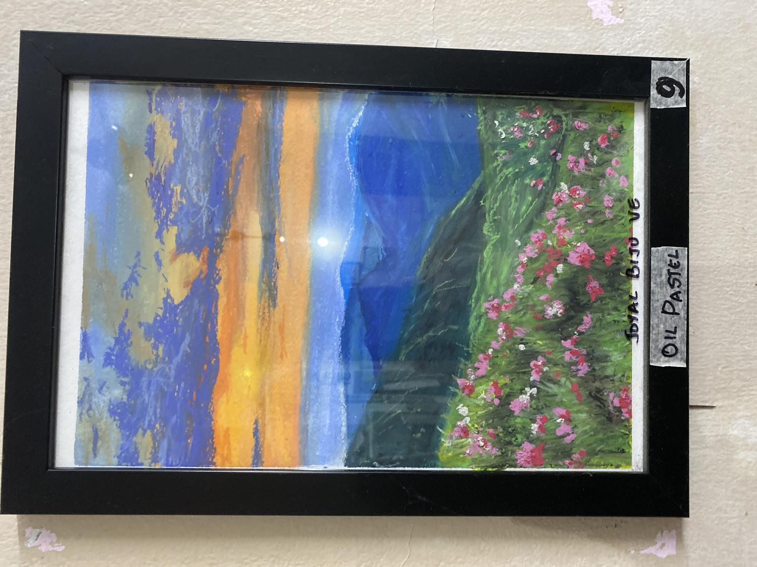 A vibrant landscape capturing the beauty of the natural world. Created using oil pastels, this piece features bold blending techniques and rich colors, showcasing the creativity and developing artistic perspective of the artist during his primary school years.