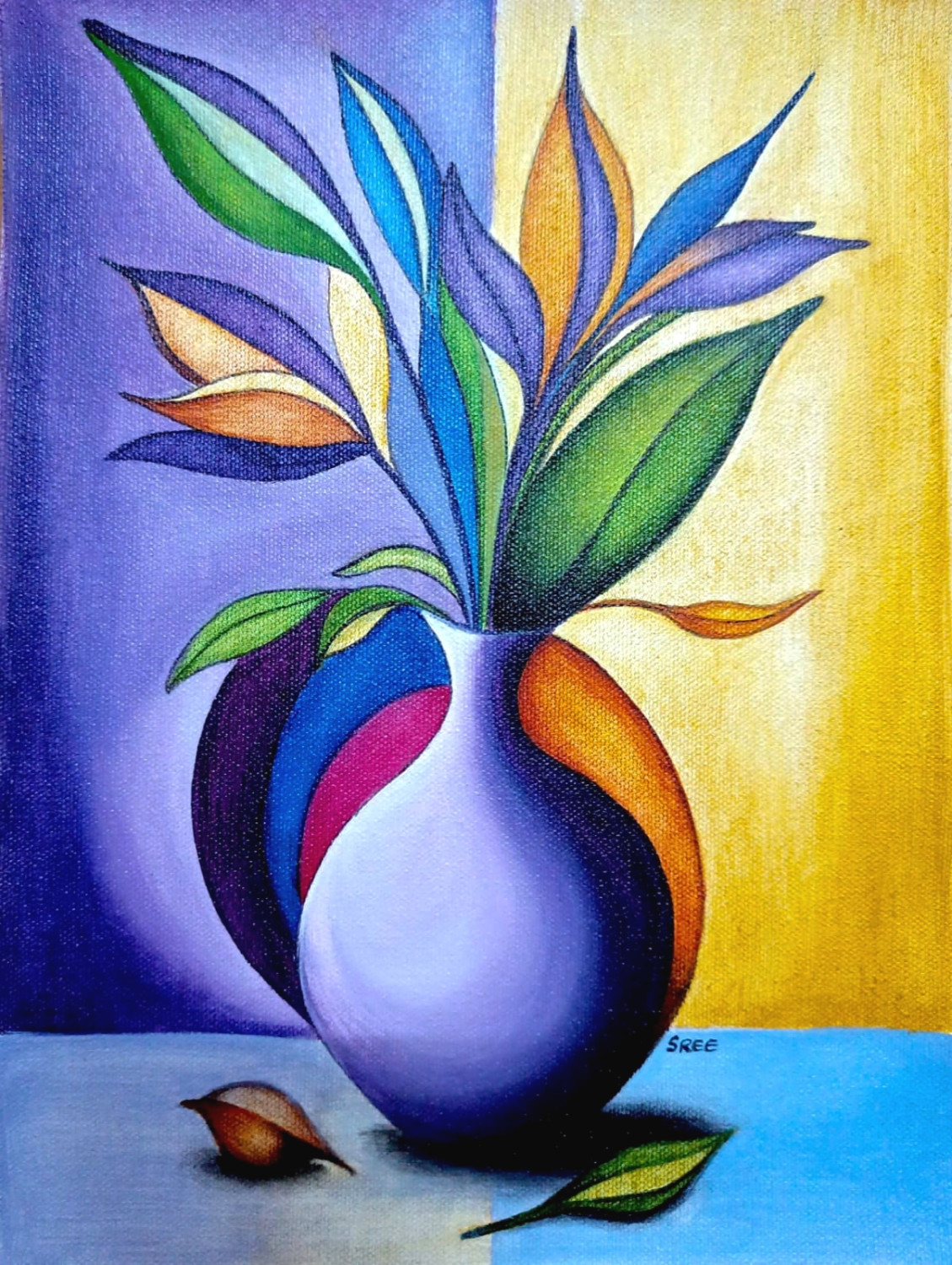 The artwork combines modern decorative style with careful colour blending and texture to create depth and balance.