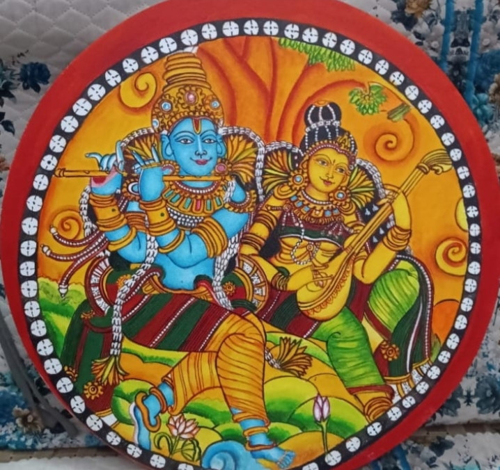 A painting in round canvass using acrylic paints in mural art form .