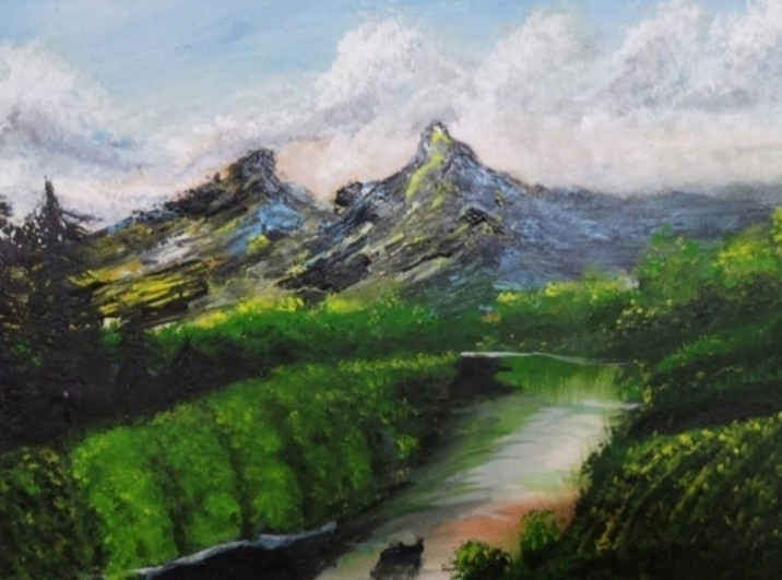 Acrylic painting in canvas with size 16"x16".A natural scenary of mountain .