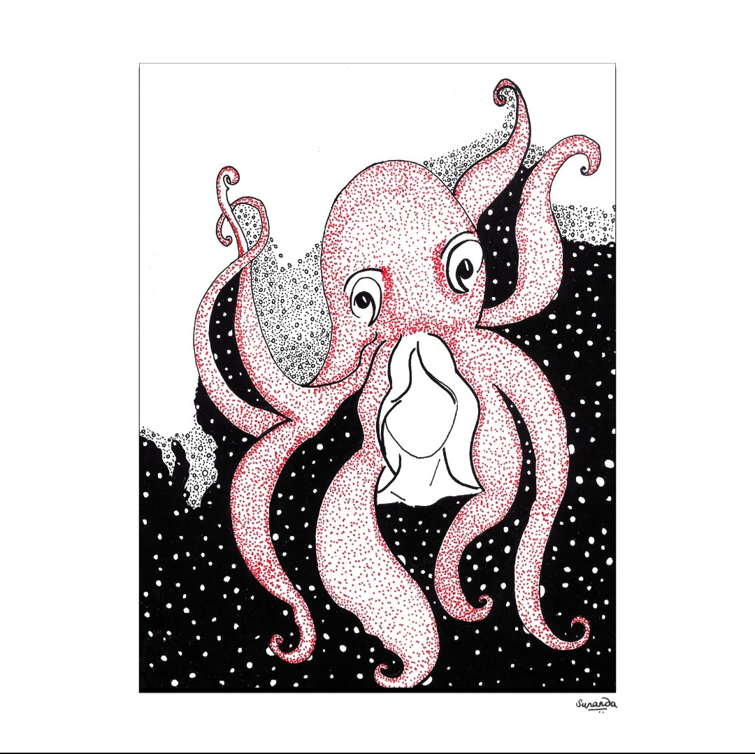 Depression is portrayed as an octopus that quietly wraps its arms around the mind and soul. It's unseen, suffocating, reflecting the silent struggle of being held by emotions too heavy to escape, yet too invisible to be understood.