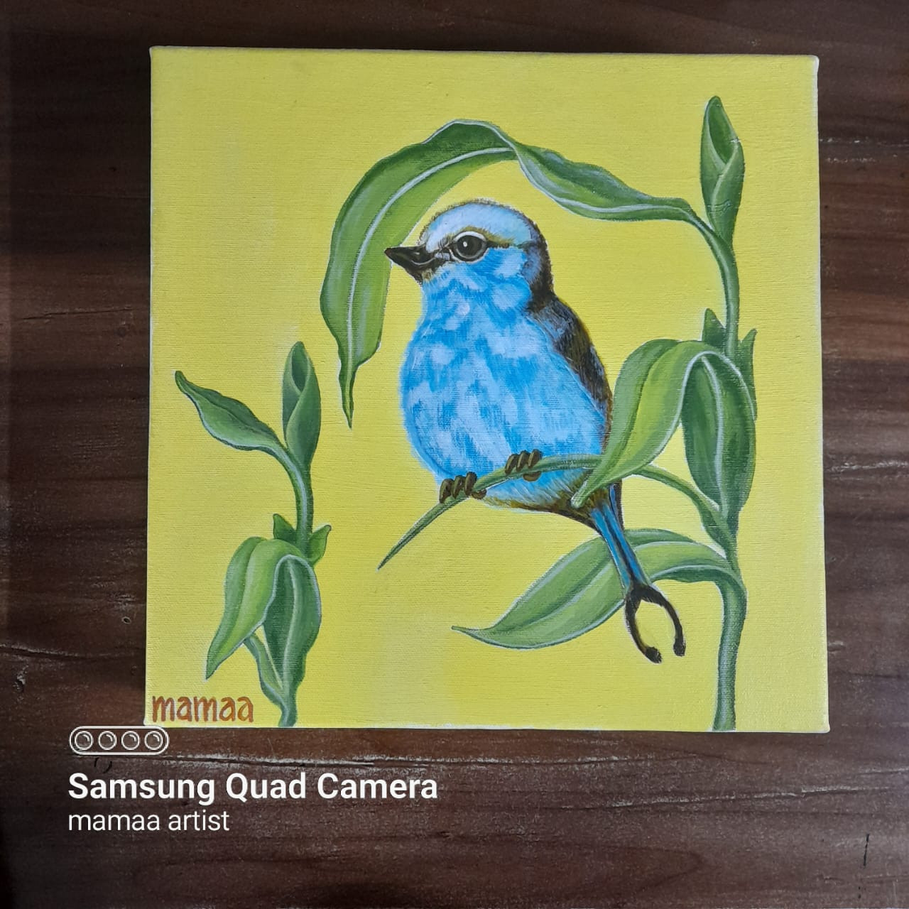 A vision of calm and clarity, Blue Lenses by mamaa draws viewers into a world seen through the soft, reflective hues of a delicate blue bird. Poised gracefully among fresh green leaves, the bird seems to shimmer against a radiant yellow background ~ as if sunlight itself has paused to admire its charm. The artist’s brush captures both the gentle fluff of feathers and the stillness of nature’s quiet moment. Through this vibrant contrast of cool blues and warm yellows, Blue Lenses invites the audience to experience nature’s poetry through the bird’s tranquil gaze ~ a reminder to see the world with freshness, wonder, and peace.