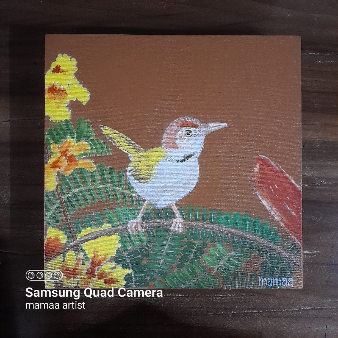 This delightful artwork by mamaa captures the serene beauty of nature through the gentle presence of a small bird perched amidst lush green leaves and golden blossoms. The warm earthy background enhances the vivid hues of the feathers and flowers, creating a harmonious balance between calm and vibrancy. With delicate brushwork and soft tonal transitions, Captivating Dream Weaver invites the viewer into a tranquil moment of stillness and observation ~ where nature whispers its quiet poetry through color and form.