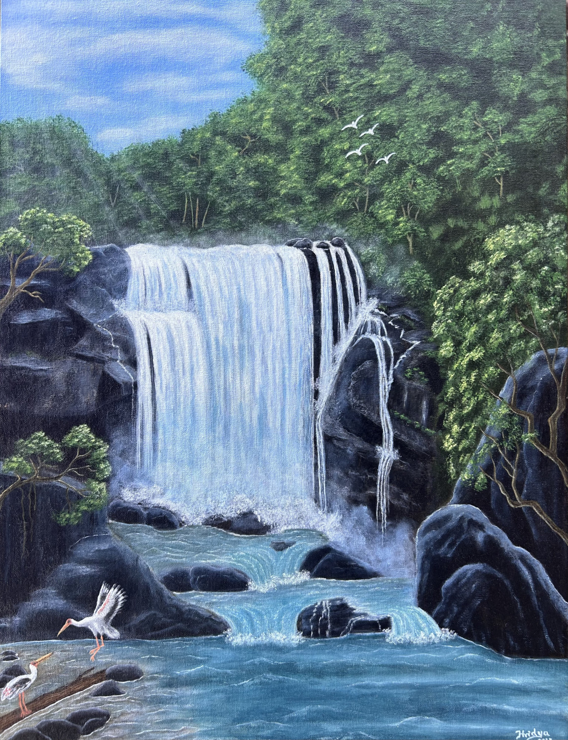 Painted with precise detail, each element contributes to the balance and harmony of the scene.Through these details, the artist successfully captures not just the visual aspects of a waterfall, but also the nature's rhythm.