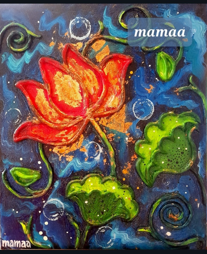 “Blossom” bursts with life, colour, and celebration. At the heart of the artwork, a radiant lotus unfurls its fiery red and gold petals, symbolising beauty emerging from depth and resilience. Surrounding it, vibrant greens and swirling blues dance together, creating a sense of movement, joy, and cosmic harmony.