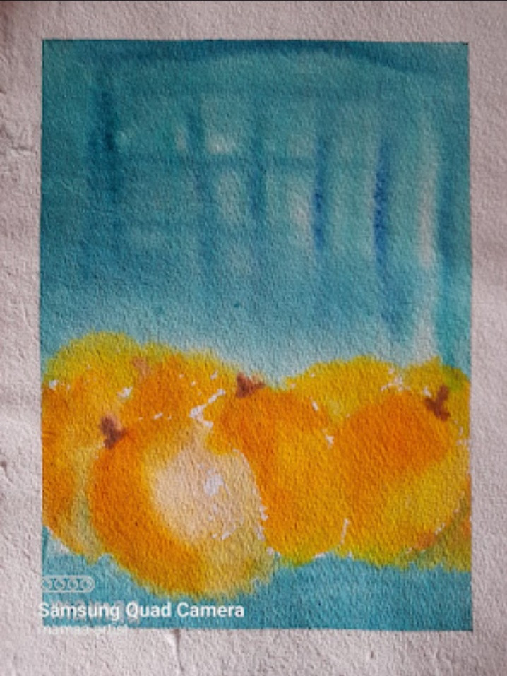 Using the gentle transparency of watercolor, the artist layers colour like whispered emotion ~ soft edges melting into one another, echoing the fleeting, excited energy of a moment about to unfold. The contrast between the calm blue and the vibrant yellow creates a harmony rooted. Cool meets warm, stillness meets anticipation, serenity meets joy.