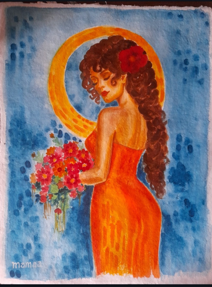 Behind her, a golden halo rises like a moon of devotion, its radiant curve balancing the cool, dreamy blues that surround her. This interplay of complementary colours ~ warm against cool, fire beside calm ~ evokes the essence of fine art harmony, where emotion is carried not only by form but by the dance of tones.
