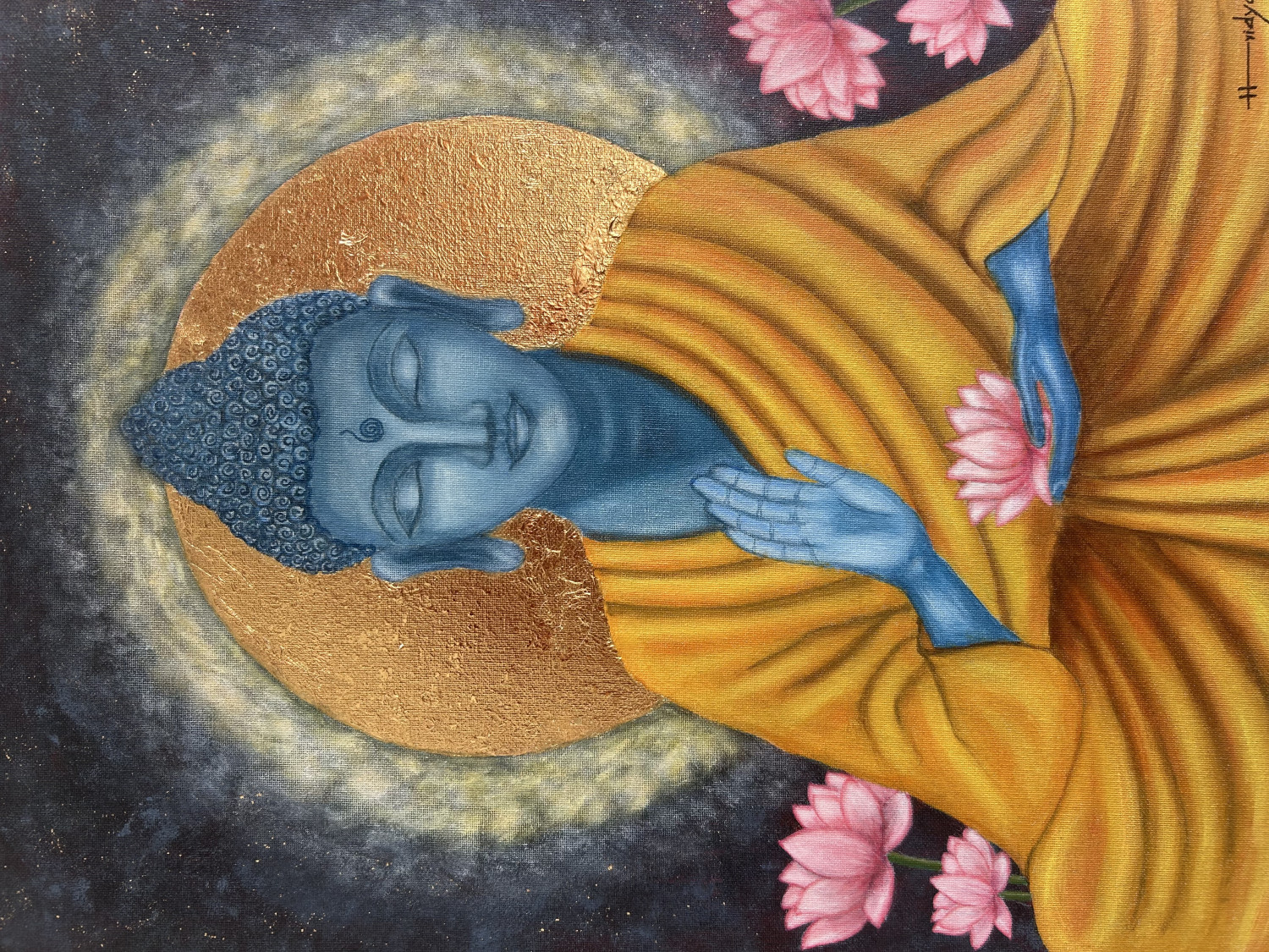 This artwork portrays the Buddha in meditation, radiating peace and spiritual strength with a gold-foil circle forming a halo around the Buddha’s head. With the right hand raised in Abhaya Mudra—a gesture of protection and reassurance—it reflects the essence of fearlessness and the calm path toward enlightenment.