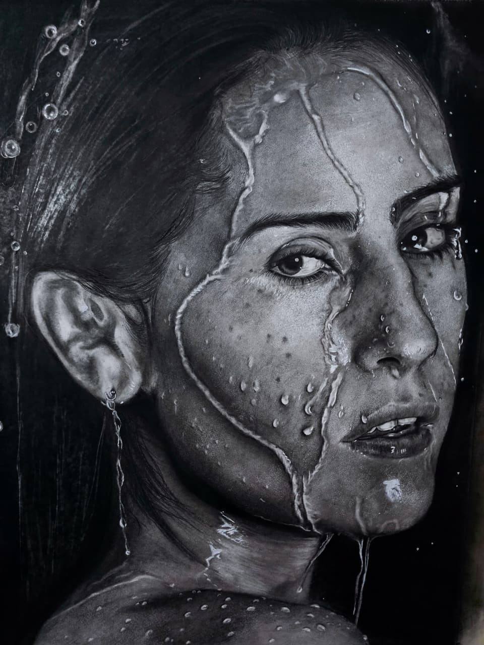 It’s a hyperrealistic charcoal portrait capturing a woman’s face drenched in water, with striking detail and emotion. I focused intensely on light and shadow to depict glistening droplets, wet skin, and a deep, expressive mood.