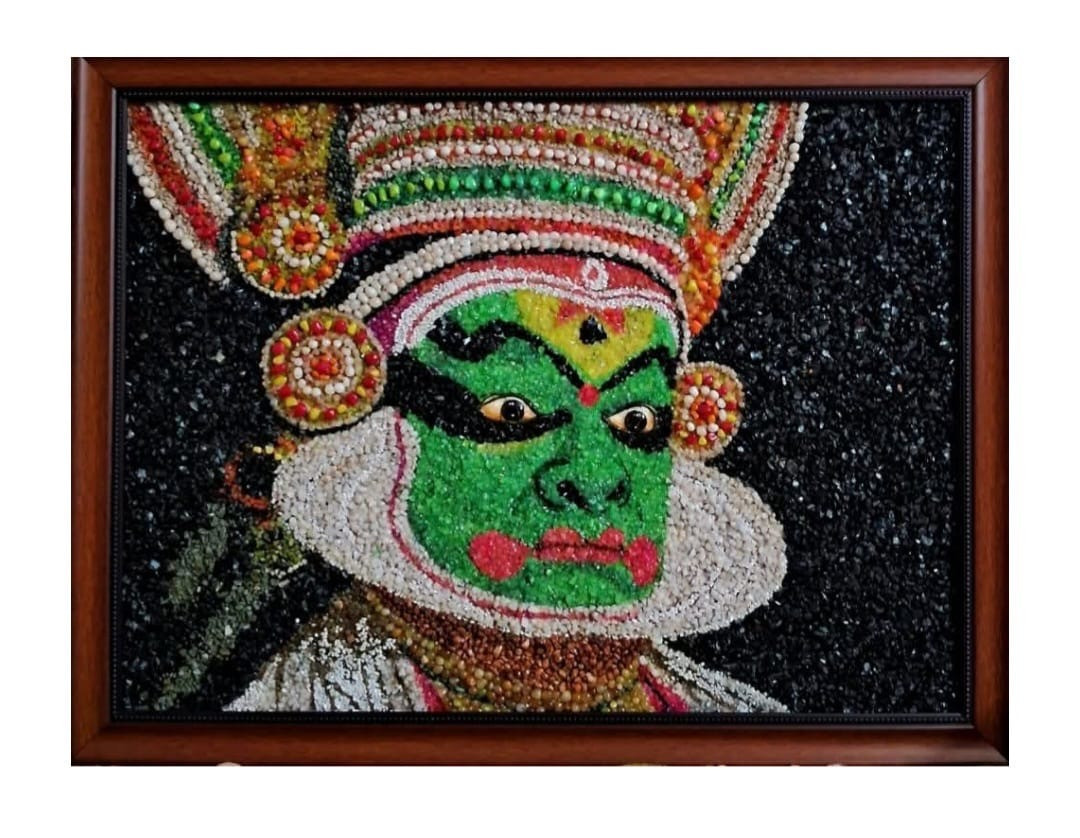 A striking interpretation of a Kathakali character, this piece brings the classical Kerala dance-drama to life with innovation. Instead of conventional painting, the intricate composition is achieved solely through the careful placement of natural and artificial stones, making it truly unique.