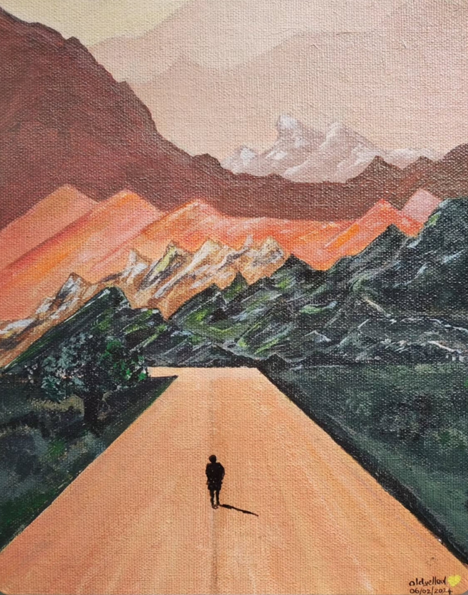 Experience the quiet draw of "Drift", a one-of-a-kind original acrylic painting that commands presence and capitivates the soul. Measuring 8 x 10 inches, this canvas embodies escape to mountains, serenity and explore the world through the eyes of oneself-an invitation to pause, breathe and to become oneself. It represents the love for travelling, explore and escapism.