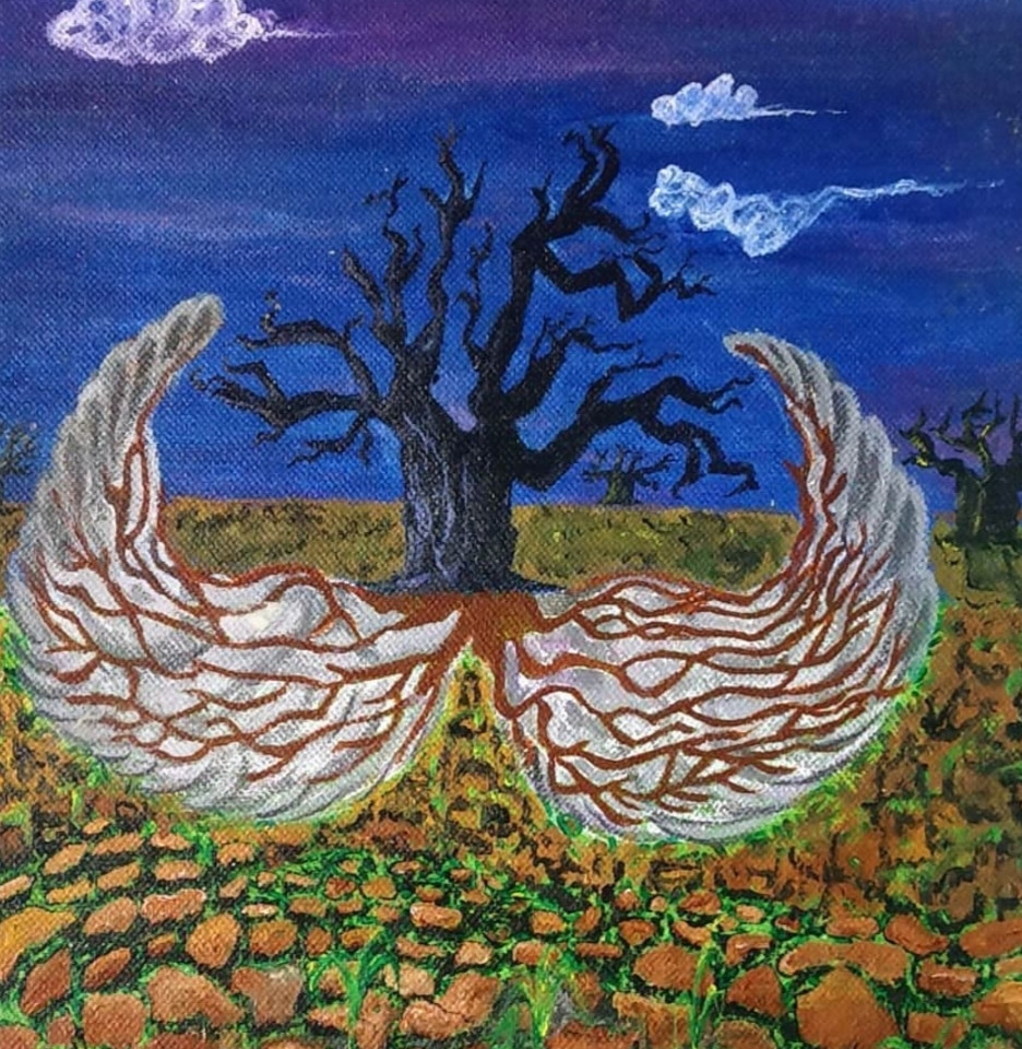 Experience the quiet draw of "RootWings", a one-of-a-kind original acrylic painting that embodies cry of nature. Measuring 6 x 6 inches, this canvas represents nature, to save trees.