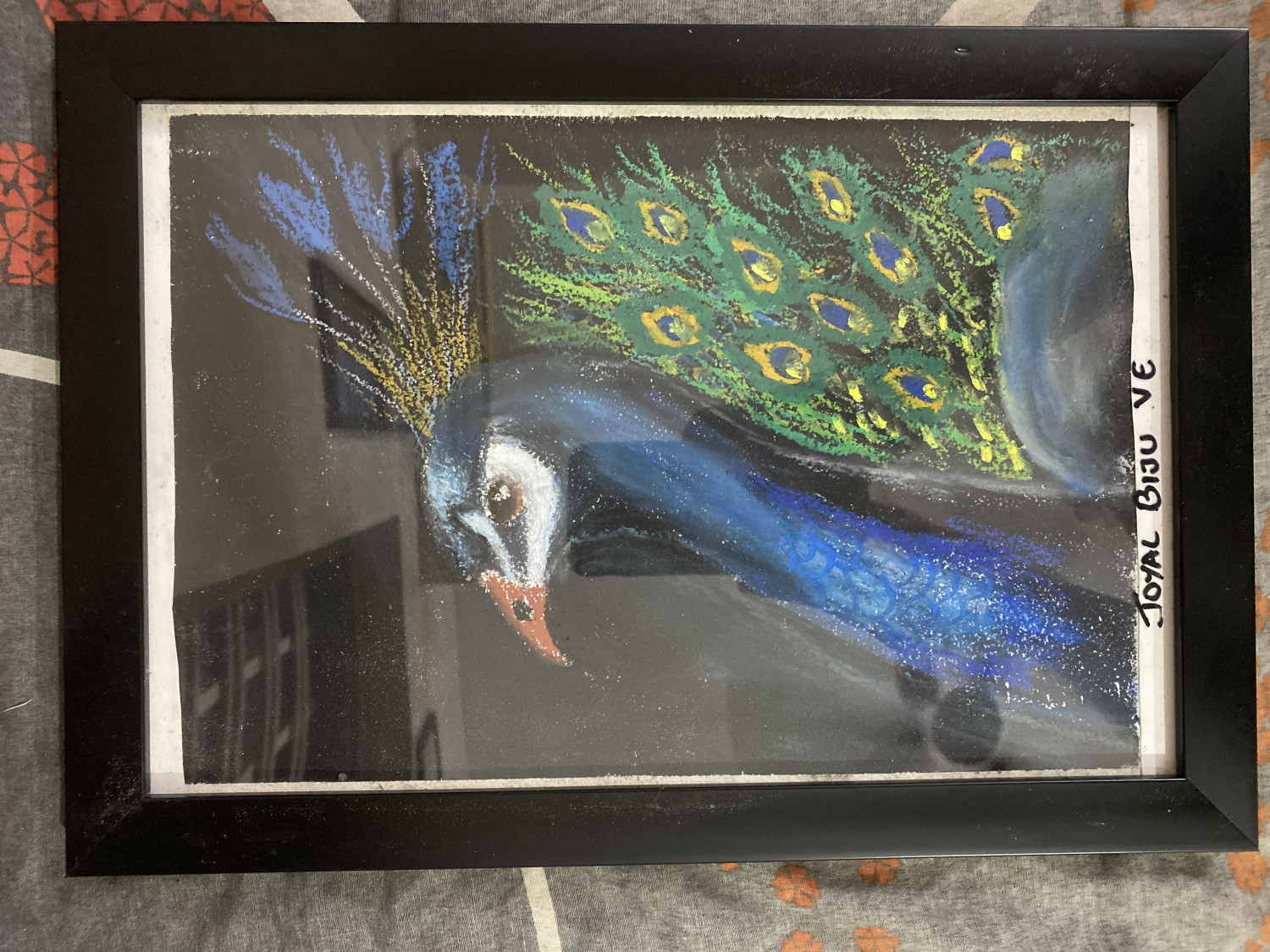 A vibrant depiction of a peacock, India's national bird. This artwork utilizes the rich texture of oil pastels to showcase the bird's iridescent blue neck and the magnificent array of feathers. The artist has skillfully blended colors to capture the beauty and grace of nature.
