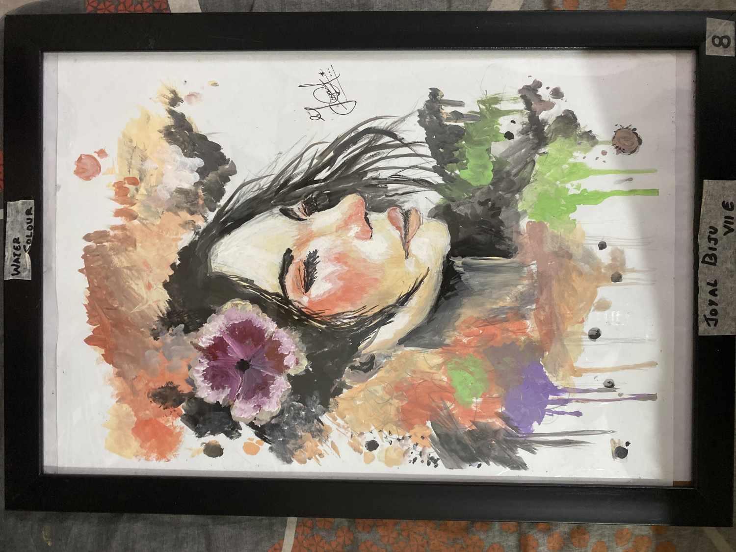 ?This beautiful acrylic piece captures a moment of quiet reflection. A delicate portrait of a woman with a purple floral headpiece is set against a backdrop of vibrant, splashing colors. The contrasting drip effects and bold hues of orange and green bring an energetic life to the canvas, while the subject remains peaceful and still. A wonderful example of expressive portraiture by young artist Joyal Biju.