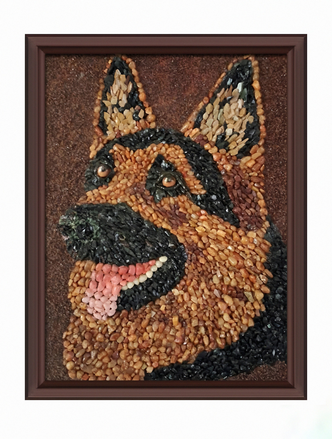 A close-up stone mosaic of a German Shepherd, showcasing its friendly expression and intricate fur patterns. The blend of dark and light stones adds depth, making the portrait engaging and full of character.