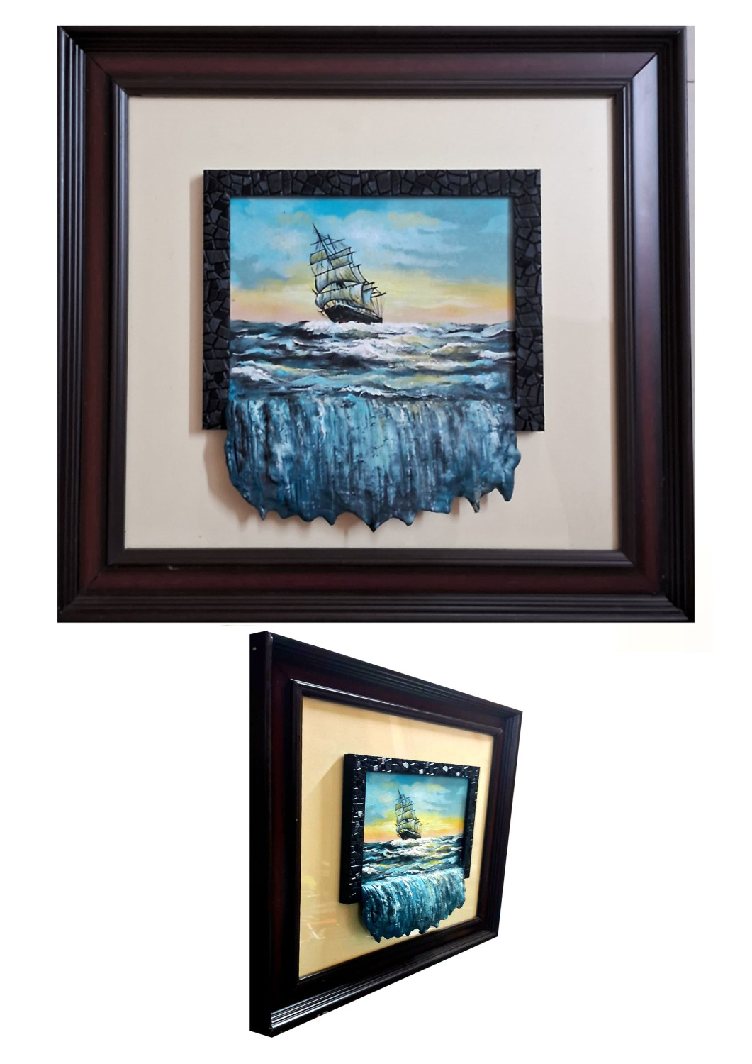 This 3D artwork brings the seascape to life, with a ship sailing through textured waves that physically extend beyond the frame, creating a stunning illusion of motion and depth. The sunset sky and cascading water amplify the feeling of adventure and boundless exploration.