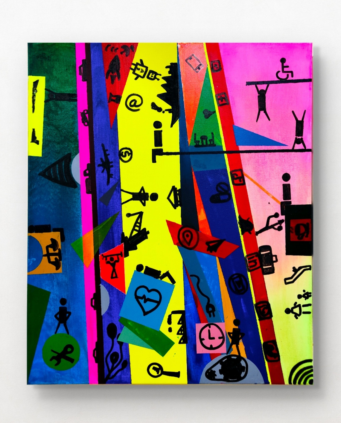 " Symbols of Modern Life " is a dynamic and colorful exploration of contemporary existence, featuring a vibrant collage of icons and imagery. The use of bold colors and varied shapes represents the complexity of modern life, highlighting themes such as communication, health, and technology. Each symbol invites viewers to reflect on the interconnectedness of daily experiences, making it a thought-provoking commentary on the world we inhabit.