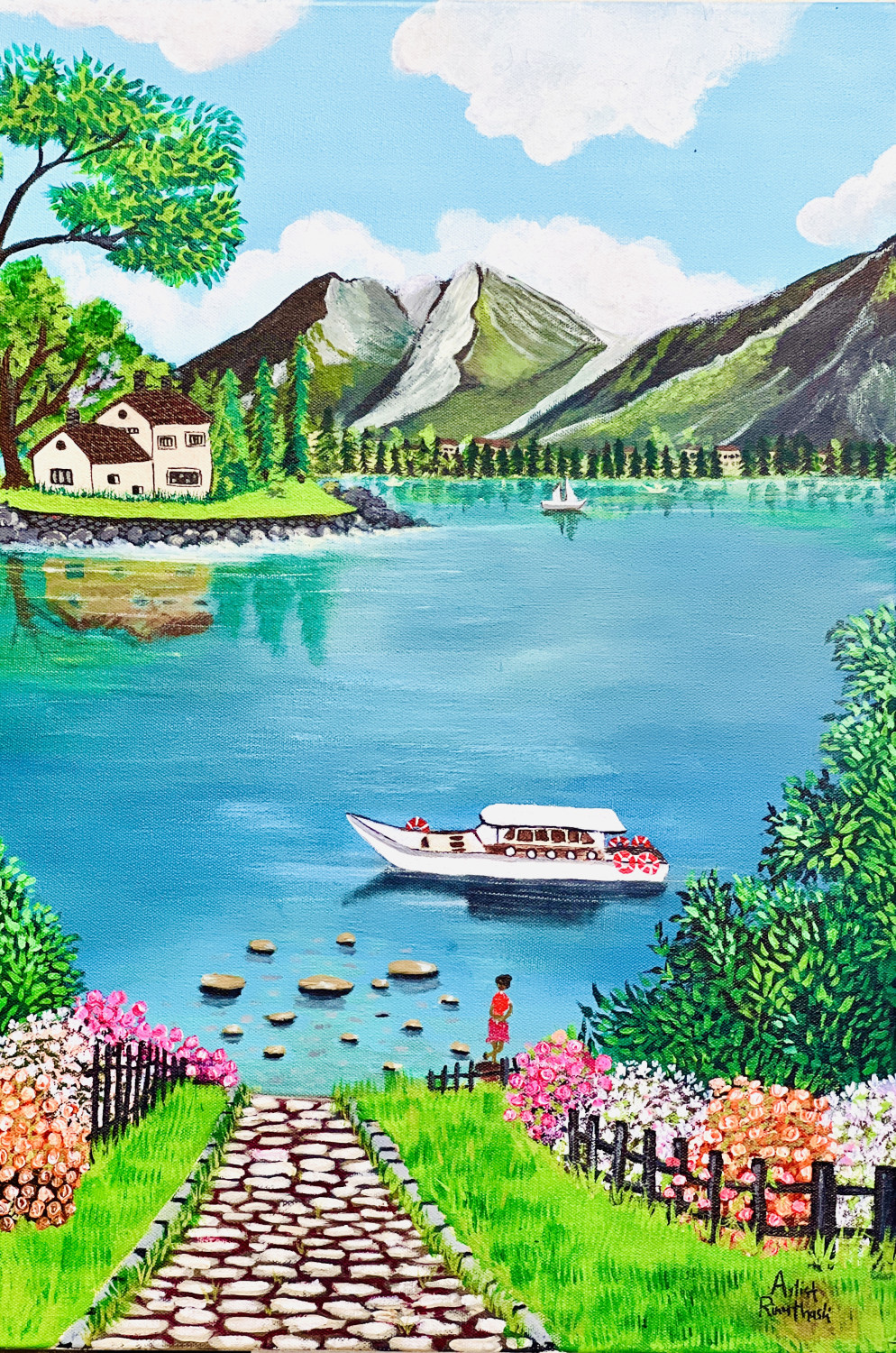 “This acrylic landscape painting brings the calm and beauty of nature into your space. Flowing water, gentle mountains, and a peaceful home create a sense of serenity and balance, making it a perfect addition for anyone seeking warmth, harmony, and quiet elegance in their surroundings.”