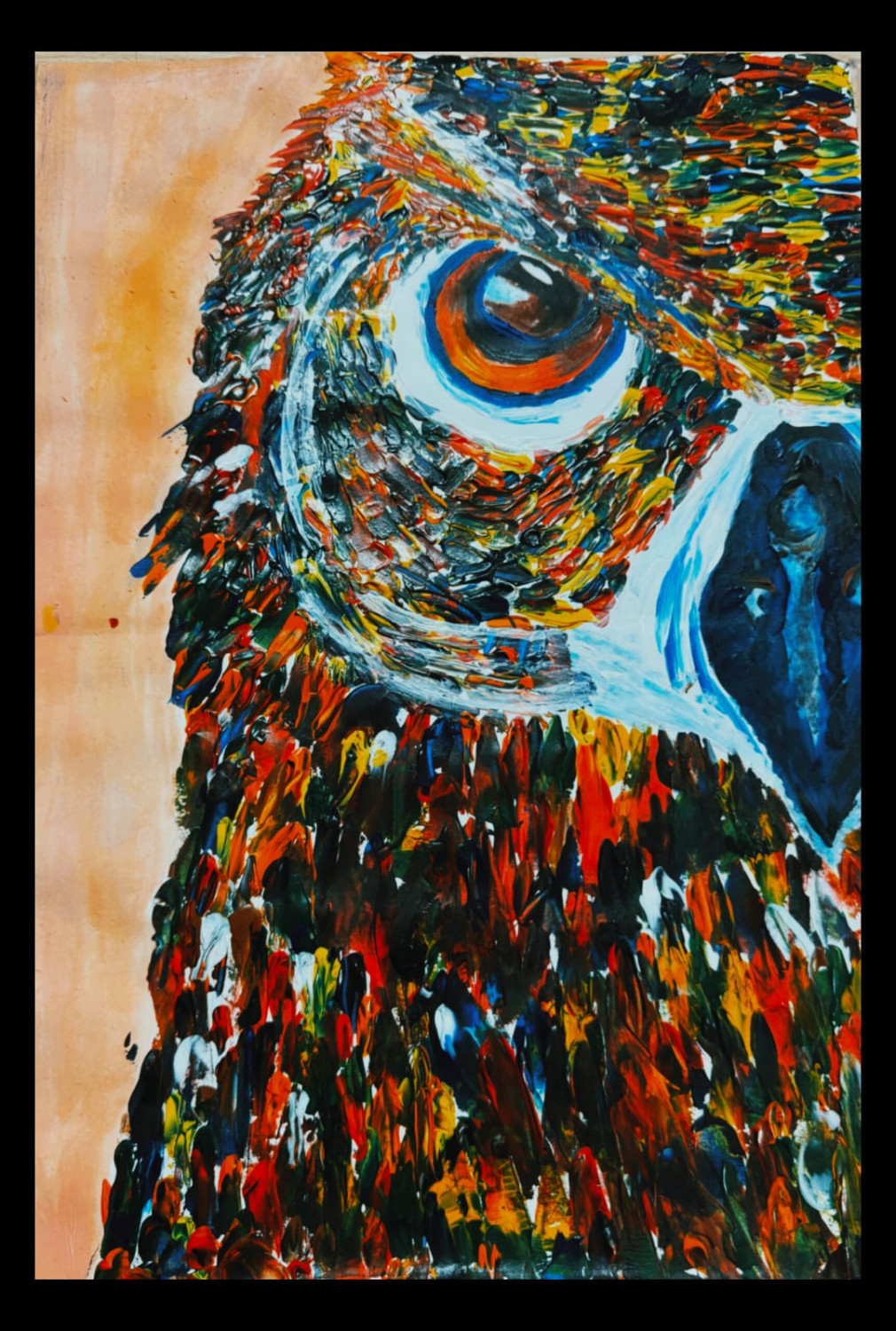 This artwork presents a detailed and expressive depiction of an owl, a widely recognized symbol of wisdom, intelligence, and alertness. The painting uses bold yet controlled brushstrokes and a rich combination of warm and cool colours to create visual depth and texture. The owl’s focused eye forms the central point of the composition, conveying awareness, concentration, and quiet strength.