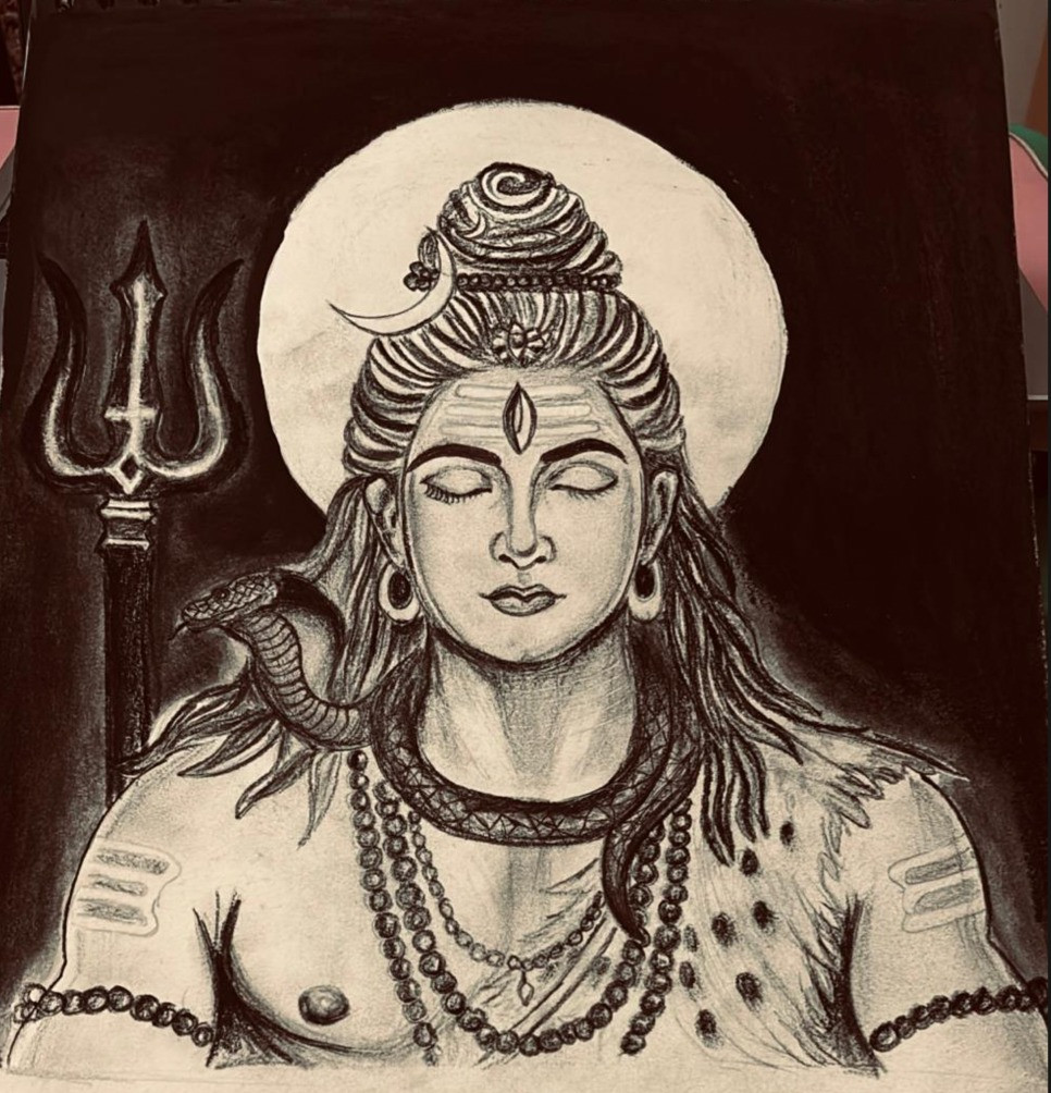 The piece is primarily created using acrylic colors for the background, combined with detailed pencil work to bring softness and depth to the figure. The contrast between light and dark tones highlights the harmony between destruction and creation — a central idea associated with Shiva.